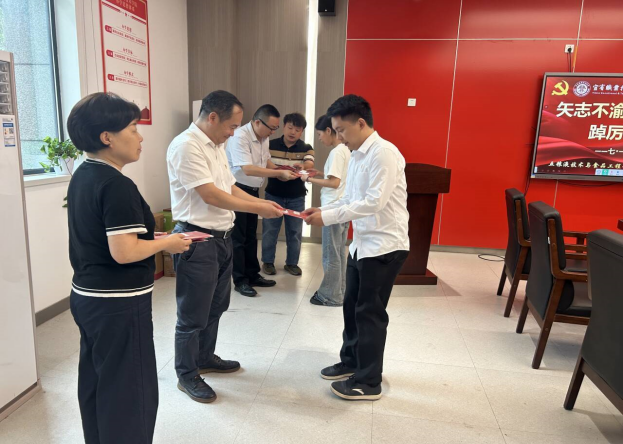 随后,党总支书记廖晓东向毕业生党员们致以诚挚祝福,在建党104周年之际向大家提出殷殷嘱托,希望大家不忘历史,树立自信;认真钻研,修身齐家;适应社会、勇往直前,大家要将个人理想融入国家发展大局,以专业能力服务社会,以广阔视野和精神风貌展现学子风采。并向毕业生党员每人赠送了一本党章、一枚党员徽章、一张政治生日卡等小礼物,希望他们时刻把党牢记在心中。