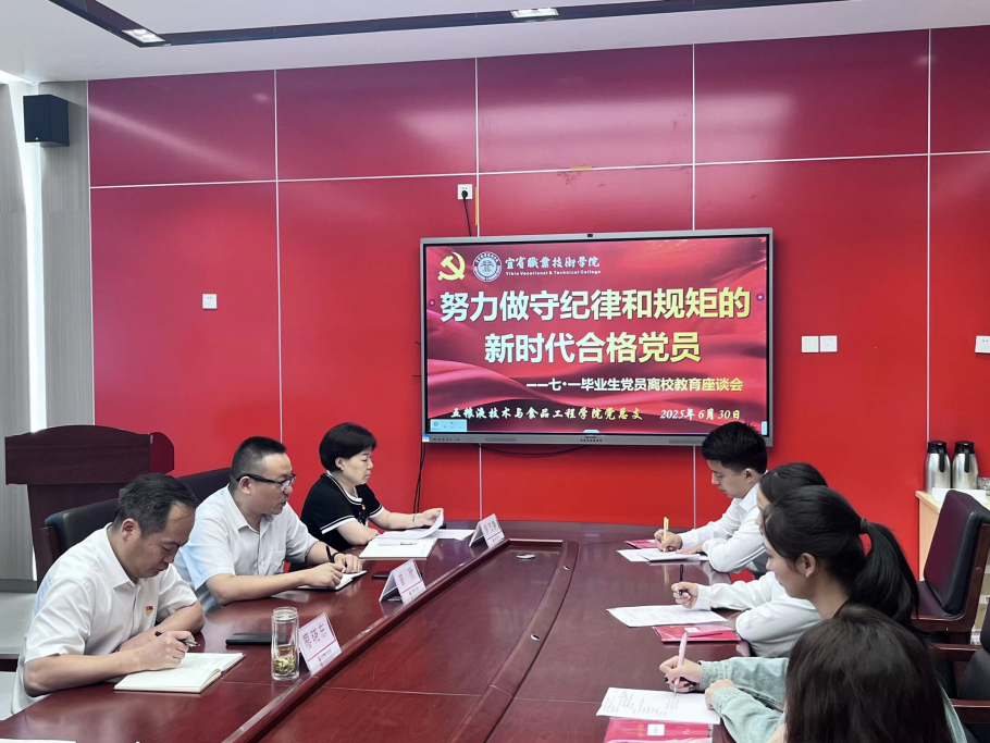 为进一步落实党员教育、管理和服务长效机制,引导毕业生党员强化理想信念,坚守入党初心,树立底线意识,6月30日15:00,五粮液技术与食品工程学院党总支在通达园党团活动室召开2025届毕业生党员七一离校教育座谈会,党总支专职组织员罗万静主持会议,党总支书记廖晓东、党总支副书记院长曾欣出席会议。