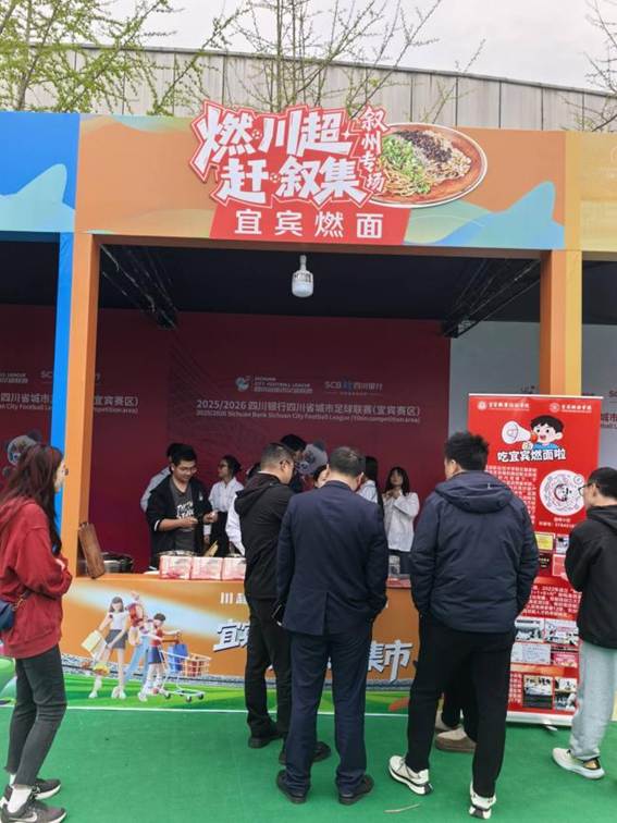 在“2025/2026四川银行四川省城市足球联赛(宜宾赛区)”的赛场外,一抹烟火气格外动人——宜宾职业技术学院五粮液技术与食品工程学院“燃小匠”先锋志愿服务队,带着标准化生产的宜宾燃面产品走进赛事现场,让地方特色美食与体育赛事碰撞出别样火花。